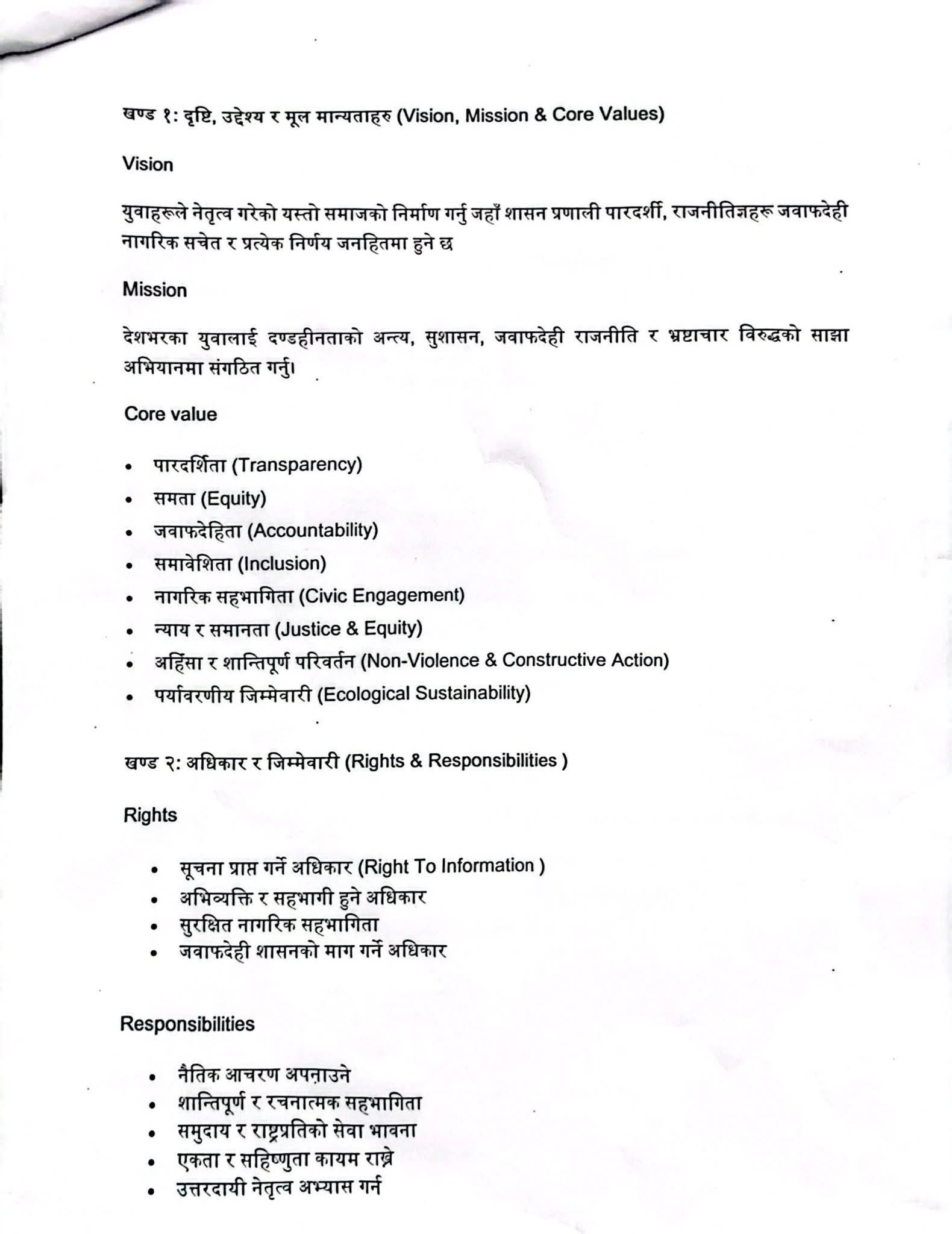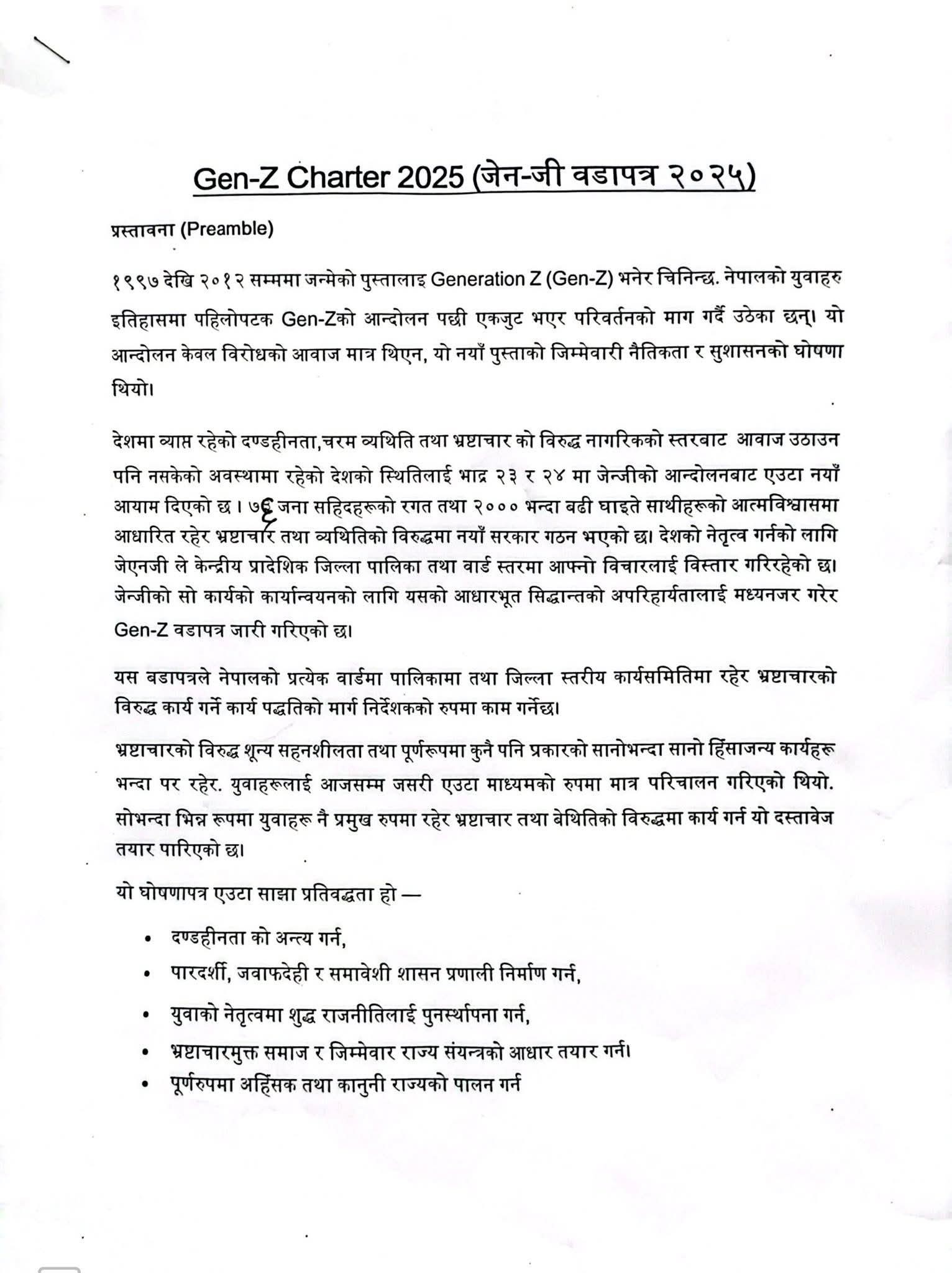 कार्यक्रममा “बडापत्र २०२५” जारी गरिएको छ, जसमा दण्डहीनताको अन्त्य, पारदर्शी, जवाफदेही र समावेशी शासन प्रणालीको निर्माणमा सहयोग पुग्ने उल्लेख गरिएको छ । साथै, युवाको नेतृत्वमा शुद्ध राजनीतिलाई पुनःस्थापित गर्न, भ्रष्टाचारमुक्त समाज र जिम्मेवार राज्य संयन्त्रको आधार तयार गर्न तथा अहिंसक र कानुनी राज्यको पालना गर्नका लागि प्रतिबद्धता व्यक्त गरिएको छ ।